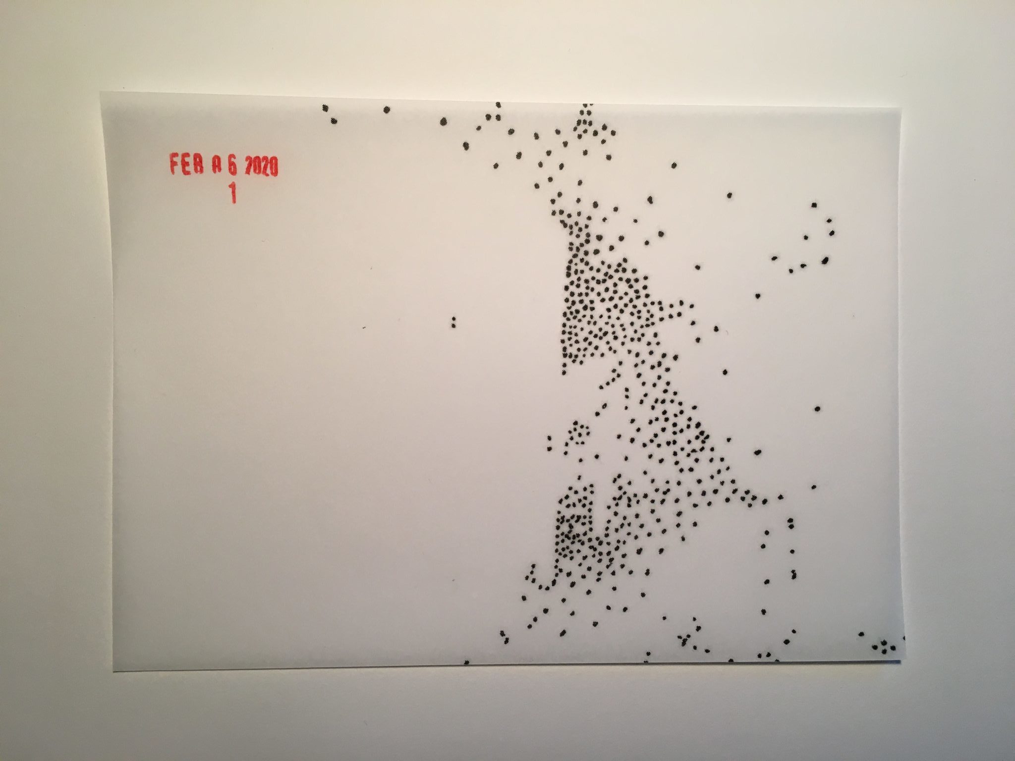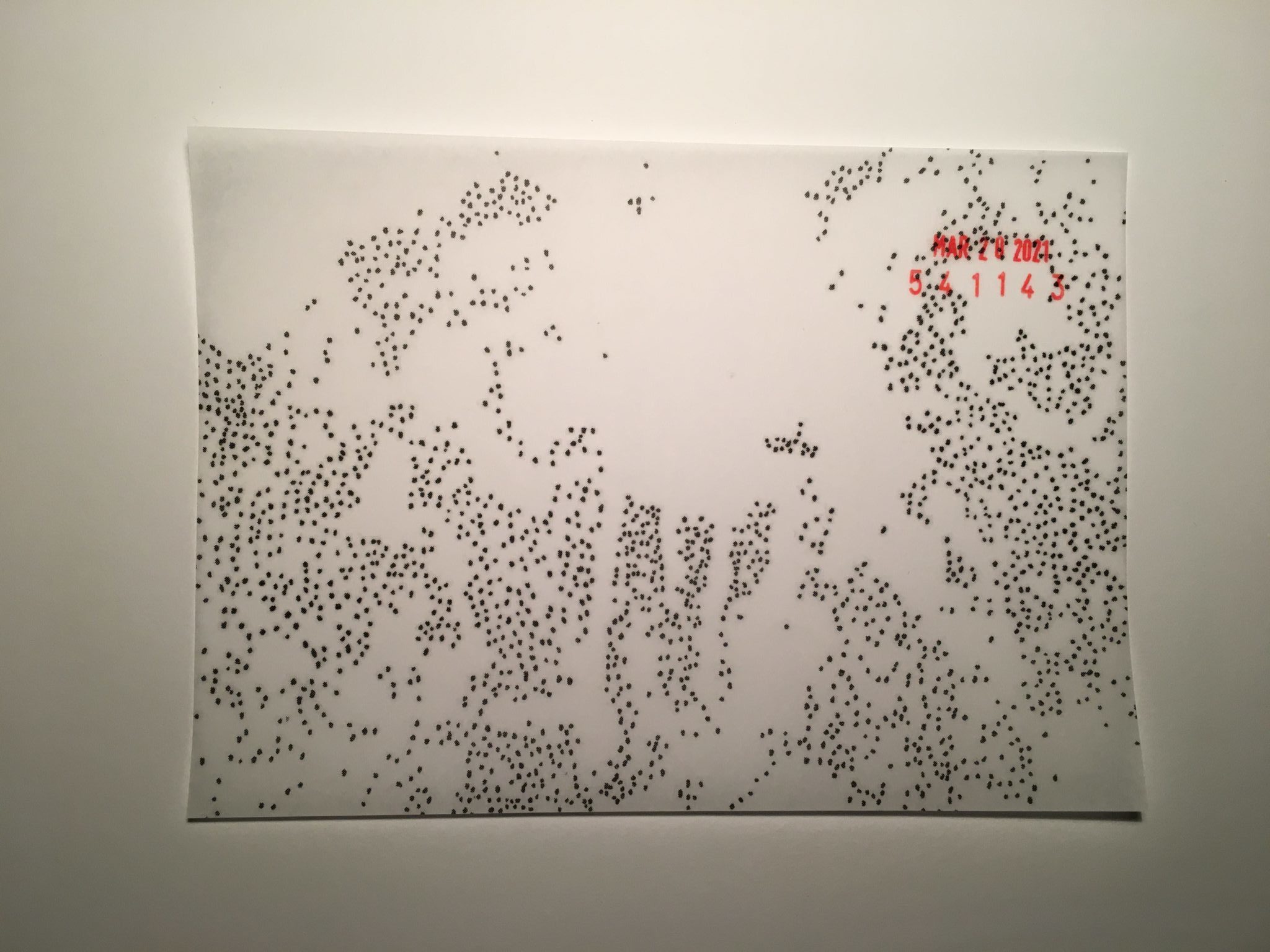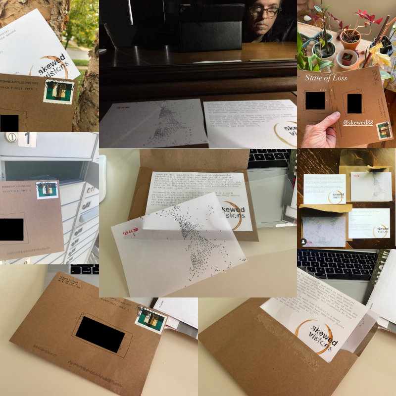 Skewed Visions produced a memorial by-mail performance commemorating the losses we have faced since the first death in the US from COVID. Titled State of Loss, it was created by Charles Campbell after the pandemic shut down all performing arts. Those who signed up received four pieces of mail over the course of a month that accumulated, piece by piece, Occurrence after Occurrence, into an Exposure. Each piece was hand stamped with a date and a number. The date of the first piece marked the first confirmed death in the US from COVID. The final date marked the last mailing. The numbers below the date marked the total number of deaths in the US from COVID on that date. The piece was mailed to four countries and 15 US states. People often sent images of themselves, their mail, and/or their mailboxes, documenting the process over space and time.